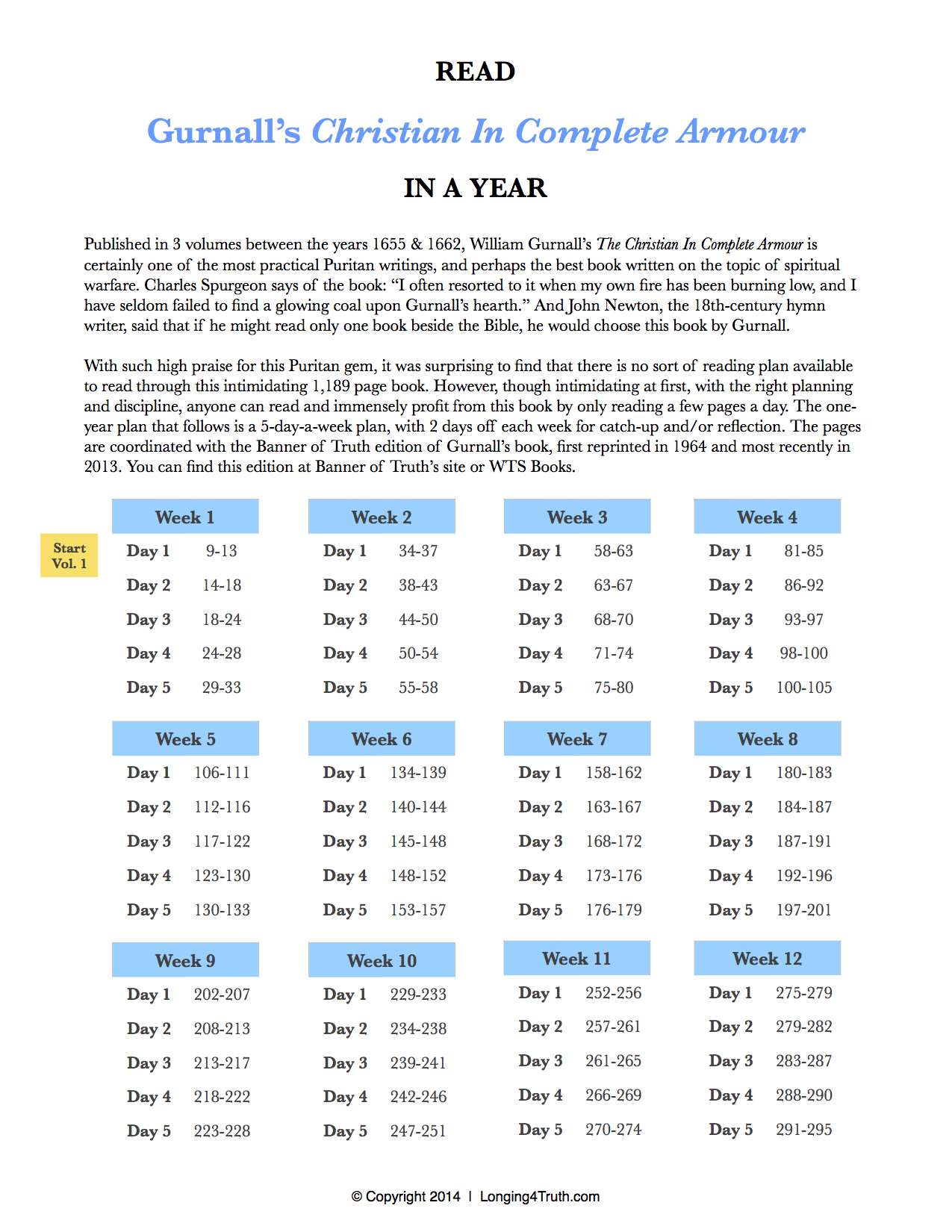 We often talk about the necessity of spiritual growth, but we rarely discuss the logistics of the battle. I came across a one-year reading plan of William Gurnall’s The Christian in Complete Armour. The grand theme of this book is spiritual warfare and we are furnishing ourselves with the “spiritual arms” necessary for the daily fight. While tackling an unabridged volume of more than 1,100 pages may seem intimidating, the reading plan below makes the task far more manageable.