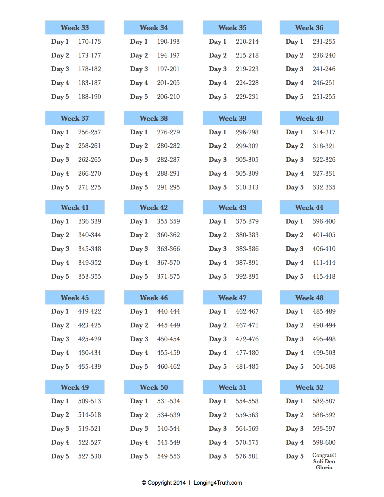 The reading plan (page one, page two, and page three) breaks it down into manageable chunks of reading only a few pages per day. Because it follows a 5-day-a-week reading plan, it allows two days within the week to catch up if needed or to reflect on what has been read throughout the week.